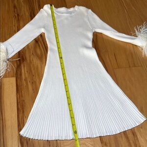 Elegant ribbed dress featuring feather cuffs. Perfect for a chic look.
