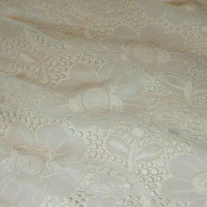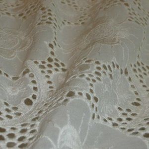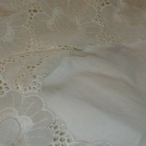 brand new dress for a little girl in the size USA 5. Made by Milly Minis, this stunning cotton lace fully lined off-white dress will be perfect for any special occasion. Navy silk trim finishes off the elegance of this perfect dress, new with original tags. Originally sold for $180.00. This dress is sized 5 by manufacturer and has navy silk covered buttons going down the back for its closure.