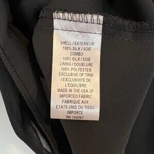 Size 8. 100% silk outer layer, polyester lining. Buttons at the back of the neck. A column of decorate black buttons up one side. Bejeweled neck. Measurements are provided in the photos.