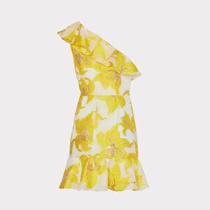 Milly Nila Metallic Fleur Jacquard Ruffle One Shoulder Mini Dress in Yellow & Gold, Size 2