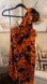 Make a statement in this stunning Milly of New York one-shoulder silk dress, featuring a navy and orange abstract floral print. This elegant silhouette showcases an asymmetrical neckline, a draped bow detail at the shoulder, and gathered ruching at the cinched waist for a flattering fit.