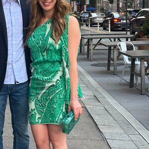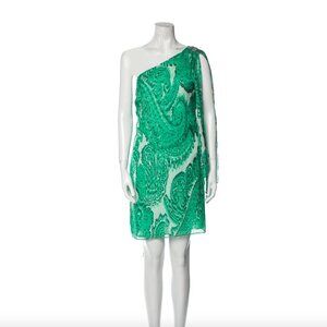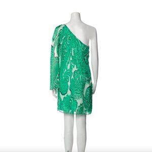 Milly One Shoulder Green Paisley Dress Rhinestone Shoulder Detail Size 8