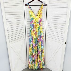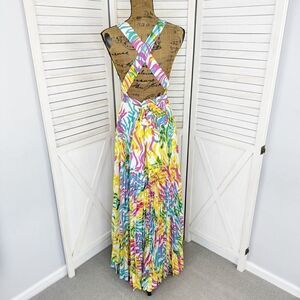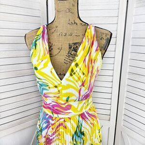 Milly Oria Waves of Zerbra Pleated Halter Maxi Dress Yellow Pink Multi Size 4