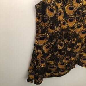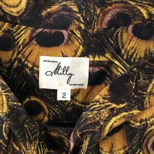 Milly peacock themed golden blouse with a tie below the neck line. Side zip closure. Dominant colors are gold and black with a hint of purple. The hem has started to fall out in the back - this could be a quick fix with some hemming tape or it can be taken to a professional tailor. Size 2. Measurements available upon request.