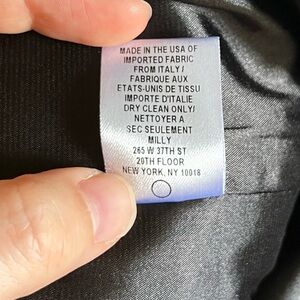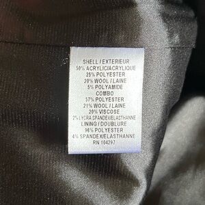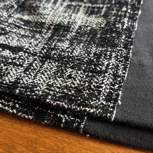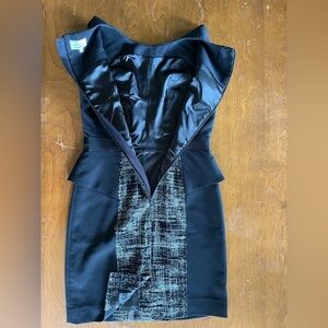 Little black dress with peplum style waist and multi colored velvet tweed color blocking. Tweed is black and white with metallic purple, green, and gold thread. Back zipper with snap, back center slit. Dry clean only.