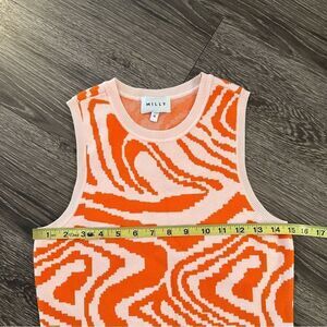 Milly midi tank dress in swirling zebra jacquard Jewel neckline Sleeveless Racerback Side slit hem Hem falls below the knee Bodycon silhouette Slipover style Viscose/polyester