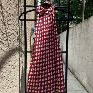 Vibrant neck tie blouse with red and blue polka dots. Adds a bold touch to any look. 100% silk