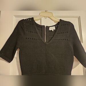 Milly Dress in Black. Stretchy, soft, textured material with open-knit details. Fit & flare style. V-neck. Short sleeves.