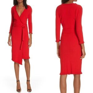 Such a classic piece. It can be worn so many ways. The wrap is faux. The fabric is amazing and super stretchy, very flattering!It’s 83% viscose and 17% polyester.