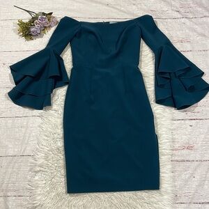 Milly Selena slit off the shoulder ruffle tiered sleeve teal colored dress. This dress is in great used condition