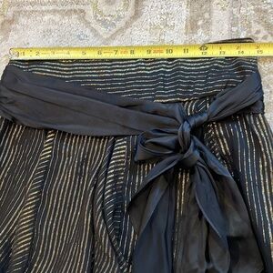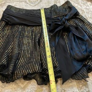 Black silk mini skirt by Milly with gold metallic thread and large bow. Size zipper. Lined. Very good condition. Size 4. See measurements in photos.