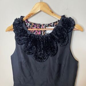 Milly of New York Beautiful Silk Wool Blend Black Sleeveless Dress with Ruffle Floral Fabric Embellished Neckline - no flaws