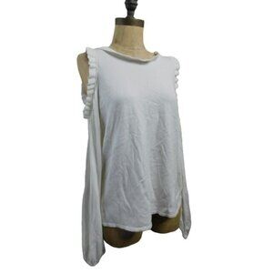 This Milly knit top in medium size flaunts a chic white cold shoulder design with long sleeves. It's perfect for casual or dressy occasions, offering both comfort and style. STRETCH Knit Fabric with cut out shoulders, ruffle trim, long sleeves, ruffle neckline
