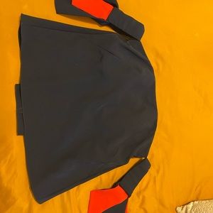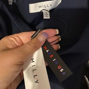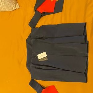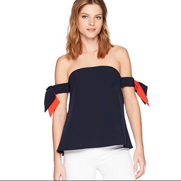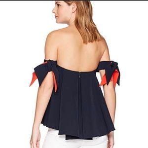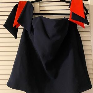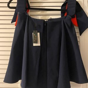 Off the shoulder Milly Top. Never been worn, new with tags! Navy blue with navy and red “tassels”. Has some boning detail in the chest area and can be worn without a bra. Zipper back closure.