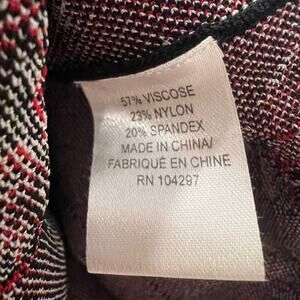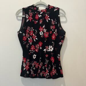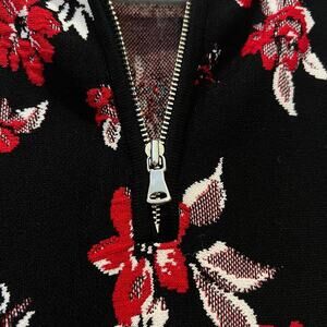 Red floral printed knit (63% Viscose, 17% Nylon, 20% Spandex). Sweater. Sleeveless. High neckline. Exposed back zipper closure