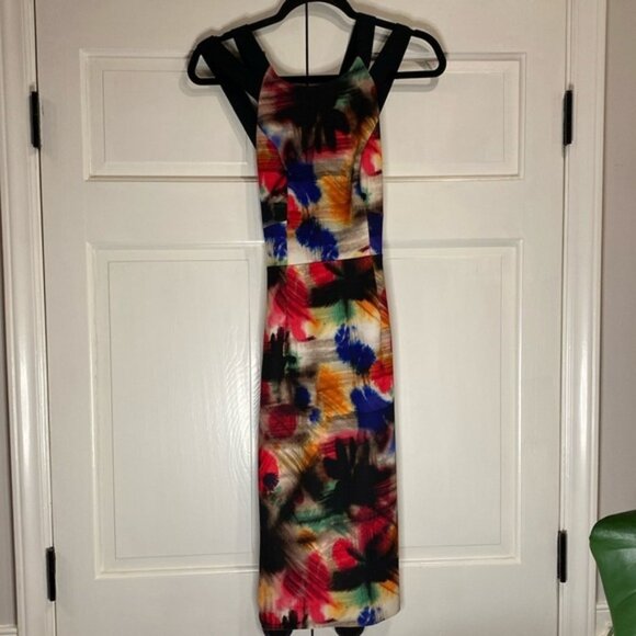 Gorgeous dress. Nylon elastane blend for stretch. Statement back that is strappy and gorgeous. Watercolor print. Preowned, no issues.