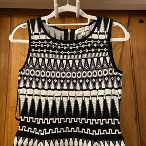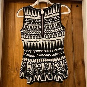 Women’s graphic Jacard flare shell by Milly. Thanks black/white sleeveless knit graphic design with a peplum type bottom. Size petite. back exposed zipper. 63% Viscose and 37% nylon. Pit to pit measures 14.5 inches and collar hem measures 21.5 inches. new with tags