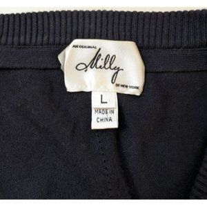 Milly black and red women's cardigan; front buttons; long sleeves; round neckline; 72% viscose, 28% polyester.