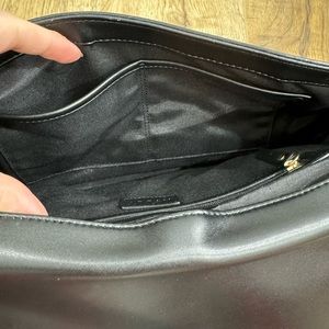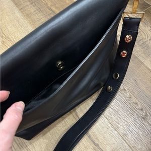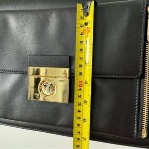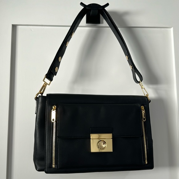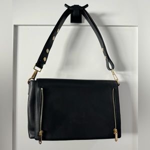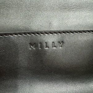 Milly shoulder bag in black leather with gold hardware. The front has a detachable clutch. Main bag has three interior pockets, one zippered. One outer pocket (two if you include the clutch). Main bag is 13x9x3, clutch is 10x6.5, shoulder drop is 10”. Dust bag included. Only used a few times, excellent condition.