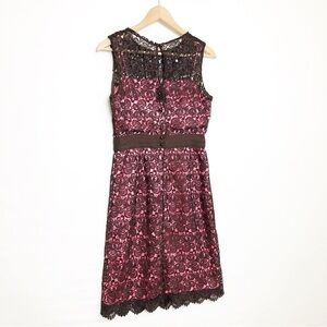 Milly brown lace overlay dress, buttons in zips at the bank with Scalloped hem with keyhole back.