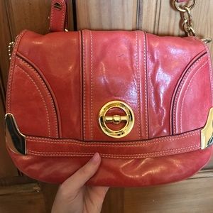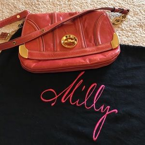 Gorgeous adjustable shoulder strap bag from Milly! Gold hardware. Twist hardware closure. Front and back large slot compartments. Two large interior compartments. Internal small zipper compartment. Small pen mark on front of bag--see photo. Otherwise minimal signs of wear; corners and leather in great condition. Clean interior. Beautiful color, great for spring, summer or fall! Can be worn as a shoulder bag or crossbody.