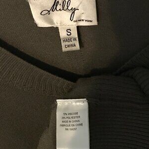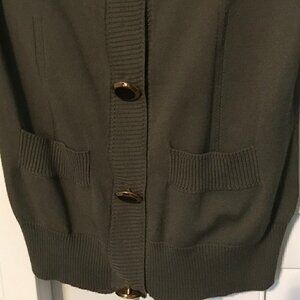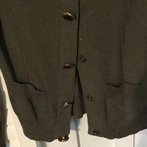 Milly of New York super soft dark green cardigan sweater with the best buttons ever - see pictures. In fact, the buttons are actually snaps and there are hooks and eyes to help create a smooth line. Little pockets on the front complete the look. Size small (S) with approximate measurements: 17 inches pit to pit and 23 inches shoulder to hem. Excellent preowned condition.