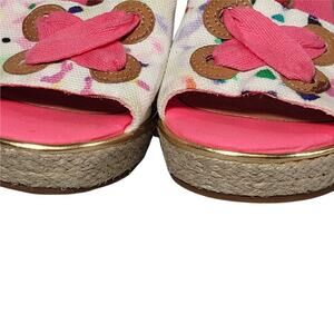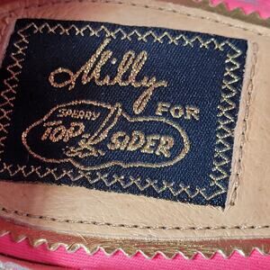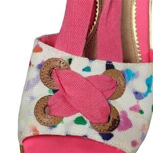 Milly for Sperry pink confetti espadrille platform wedge sandals with wrap around ankle style. Cushioned foam footbed. Size 8. Leather and cotton canvas upper. womens size 8. Excellent condition except it has a small rip to ankle tie but the charm covers it.