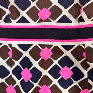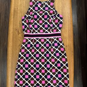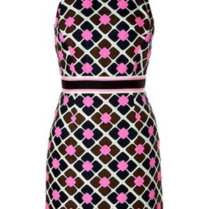 Milly of NY Anna Tile sheath dress in a neon pink, navy, brown, and off-white tile pattern.
