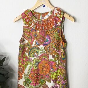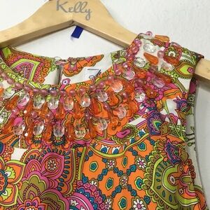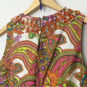 A beautiful silk dress detailed with a colorful paisley design. A gem detailed neckline. Sleeveless with a white liner under