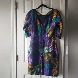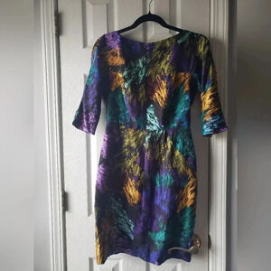 Beautiful Luxury Mini Sheath Watercolor Dress. Gently worn in great condition. 3/4 sleeves with back lower splits. Size 4 Chest/Bust 32" Length 34" Waist 27”