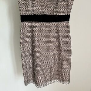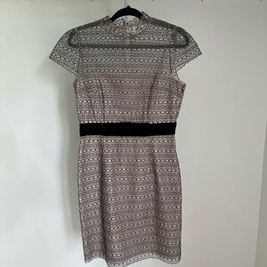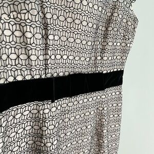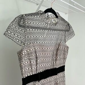 Beautiful ivory dress with black sherry overlay. Has underdress as shown. High neck with black velvet button at the back and a zipper at the side. Black velvet bow across the waist. No flaws and so darling. Vintage size 10. Best fits a modern day small to medium.
