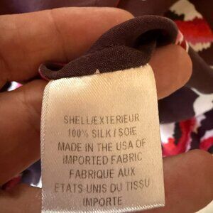 Button up front. Black grosgrain covered button. Button on each sleeve. Dark wine/brown background with red and pink poppy flowers and Milly signature in hot pink.