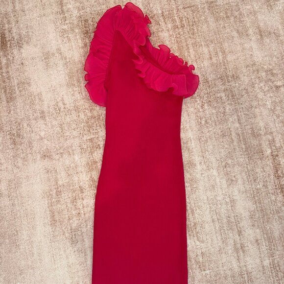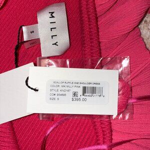 Milly one-shoulder scallop ruffle dress in a vibrant pink shade. Features a fitted ribbed body with dramatic ruffle detailing along the neckline and shoulder. Size Small. Brand new with original tags attached. Perfect for weddings, cocktail parties, vacations, or special events. Originally bought for 395.