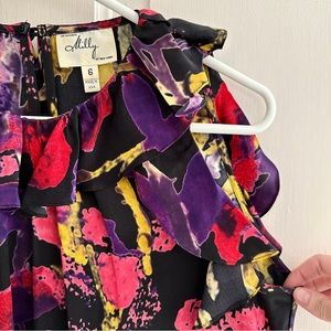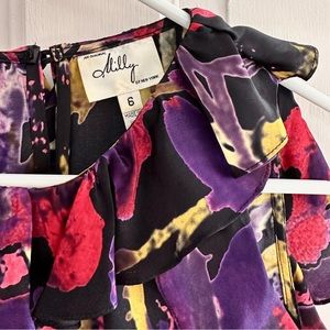 Milly black, pink, purple, and yellow printed sleeveless top with ruffles along neckline and armholes. Side zip and small keyhole and button closure at back. Only worn a couple of times.