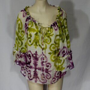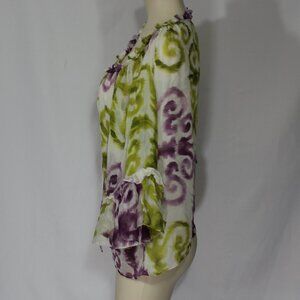 Milly of New York an original 100% silk 100% lining Roll Tab Three Quarter Ruffle Sleeve Blouse White green purple size 8; Gently used in great condition