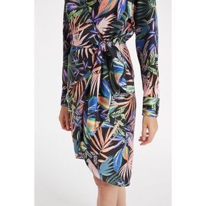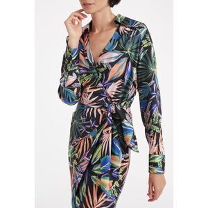 A printed wrap dress designed in our seasonal, best-selling resort print. The jungle palm print is designed with long-sleeves and features a feminine wrap bow at the waist. Wear now with black tights in colder climates, or sandals in warmer locations.