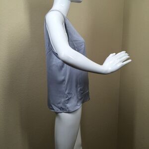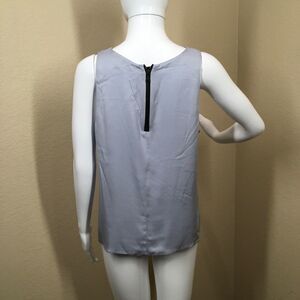 An abbreviated overlay in front creates an easy layered look on a simple tank made from fluid stretch-woven silk. Light blue/gray color