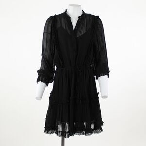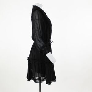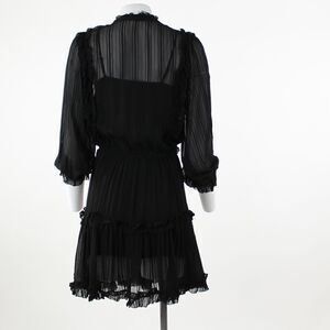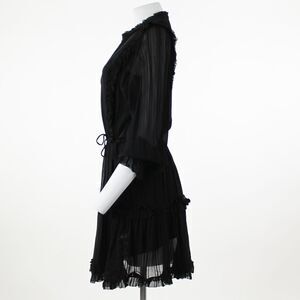 Work you wiles for black dress season in this delightful option, softly pleated and shaped with a tie at the waist. V-neck Long sleeves