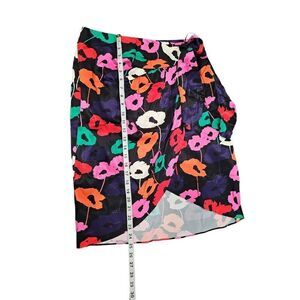 Milly "Liza" wrap skirt in poppy print. Self tie at left side of waist. Straight silhouette. High-low hem. Hem hits about at the knee. Rayon/viscose. Dry clean. Imported.