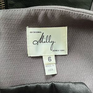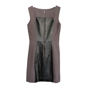 Milly of New York bateau neck sheath dress. Dark gray with with black lambskin leather paneling down the middle. Zip closure. Approximately 34” long, 17” armpit to armpit and 14” across waist laying flat.