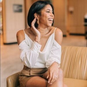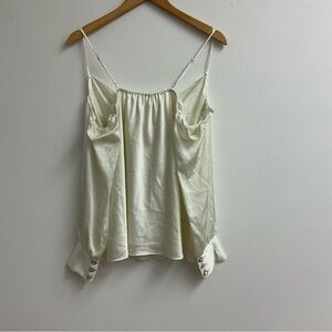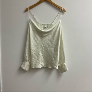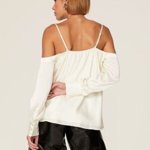 White satin (98% polyester, 2% spandex) Top. Cowl neckline. Long sleeves. Pull-on. 26" from neck to hemline. Made of imported materials, finished in the USA.