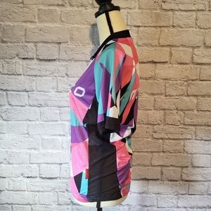 Miloto women's cycling jersey in a multicolor print. Colors include black, white, pink, purple and teal. Size L.
