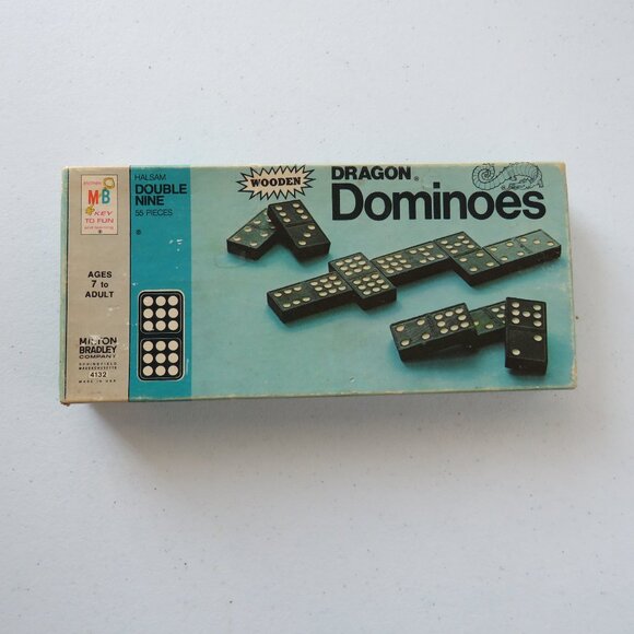 For sale is Milton Bradley Vintage Wooden Dominoes from 1970 - Complete Set of 55 Pieces - Halsam Dragon. Double Nine.