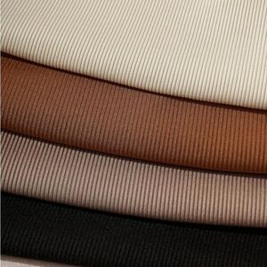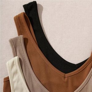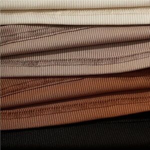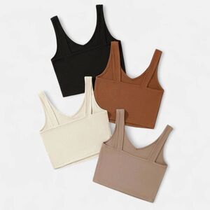 This is a set of four basic tanks. Made with a ribbed, stretchy material with a v-neck silhouette and a cropped length. The color selection is earth tone neutrals in black, terracotta, clay, and mauve. I purchased these for myself. The only one that has been worn is the black. The rest are brand new.