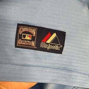 Milwaukee Brewers MLB Majestic Baseball Jersey in size unisex Small. Cooperstown collection with embroidered logo on front and sleeves. No name/number or buttons. Good used condition- I see a few very small, faint spots on the front.