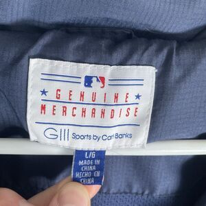 This is a Milwaukee Brewers windbreaker jacket for men in size Large by GIII designed by Carl Banks. The jacket is made of polyester softshell material with a solid blue color and features a full zip closure. It has a mid-length fit with a regular fit style, suitable for travel or casual occasions. The jacket includes zipped pockets, a collared neckline, and is wind-resistant, making it ideal for walking or baseball activities. Perfect for fans of the MLB team, this jacket embodies a classic sporty look with a touch of Wisconsin pride.
