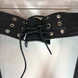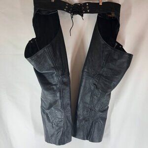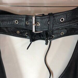 These black chaps have an adjustable waist in back and buckle in front. They are in good used condition, however there is a spot on the back of the leg that got a little hot from the muffler. There is no hole just some puckering. Shown in pictures.