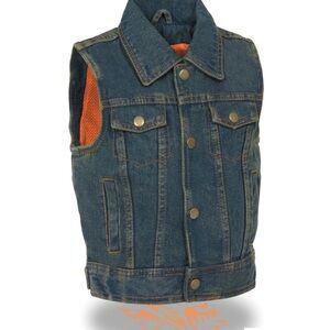 Stylish denim vest by Milwaukee Leather. Features button closure and front pockets. Perfect for layering.