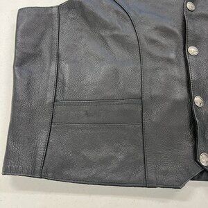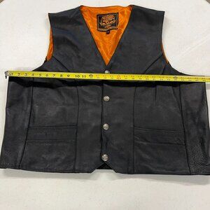 Milwaukee Mens 54 Black Premium Leather Biker Riding Vest Orange Lined V-Neck 3XL. There is a very small mark on the inside lining otherwise Excellent condition.