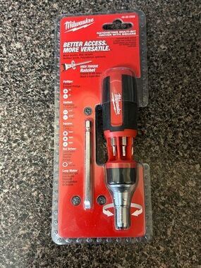 Milwaukee branded ratcheting multi-bit driver in retail packaging. Red and black rubberized handle with integrated bit storage. Includes metal bit holder and chrome-plated driver end. Compact, versatile screwdriver for multiple bits.